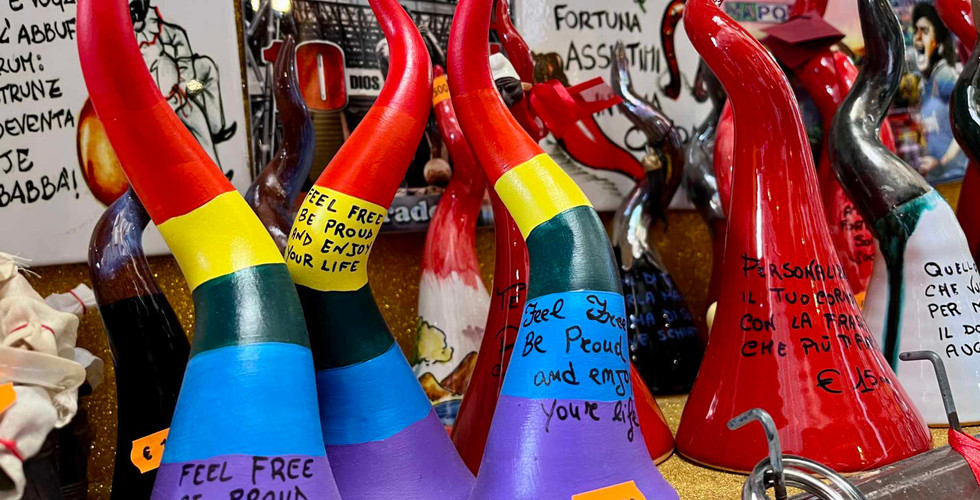 Ich laufe durch die Gassen der Altstadt Neapels und sehe sie überall rot schimmern: die Cornicelli (Hörnchen). Es sind Glücksbringer in Form eines Horns, die beim ersten Hinsehen an eine Chilischote erinnern. Diese Hörnchen haben in Neapel eine lange Tradition. Sie werden benutzt, um sich vor dem bösen Blick zu schützen und um Unheil abzuwehren.