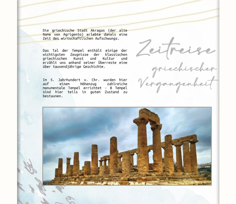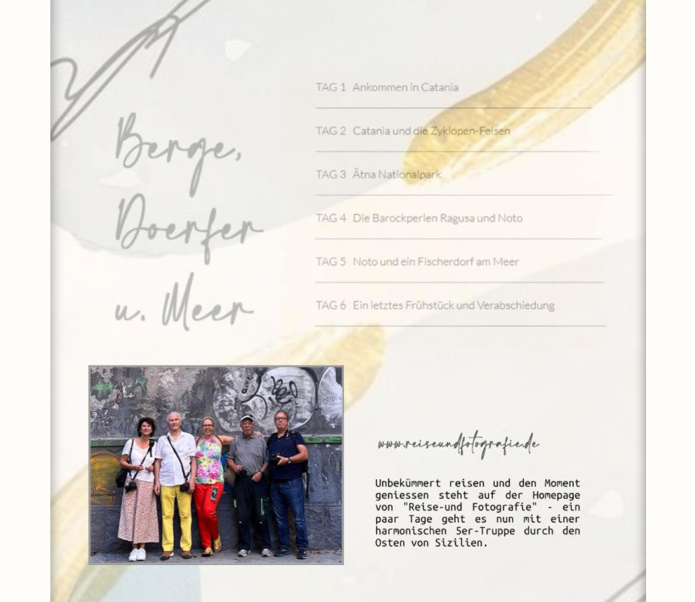Tina und Dieter reisten mit mir durch den Osten der Insel und wir besuchten zusammen die Gegenden um Agrigent im Süden und Syrakus im Osten der Insel. Im Anschluss nahmen die beiden an der Berge-Dörfer-Meer-Tour teil, bei der wir weitere Teile der Insel erkundeten und fotografierten. Seiten aus dem Fotobuch von Tina darf ich hier mit ihrer Erlaubnis zeigen.